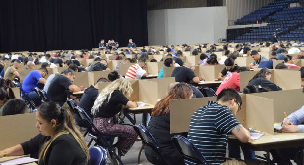 Un total de 486 personas realizaron esta mañana el examen escrito o de conocimiento para pertenecer al cuerpo de policías de Laredo, Texas, en el Sames Auto Arena.