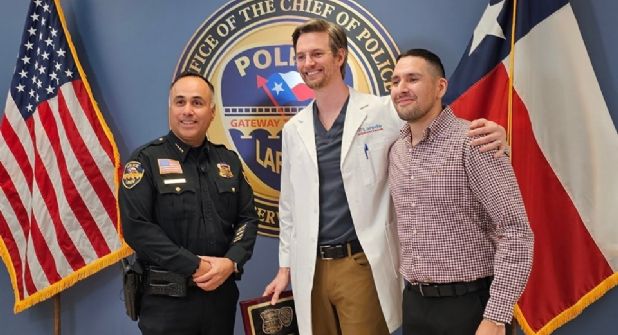 El doctor Jeff Shellenberger salvó la vida de un patrullero de la Policía de Laredo, fue reconocido por la corporación entera, Miguel Rodríguez, jefe de la agencia de ley, le entregó una placa de agradecimiento.