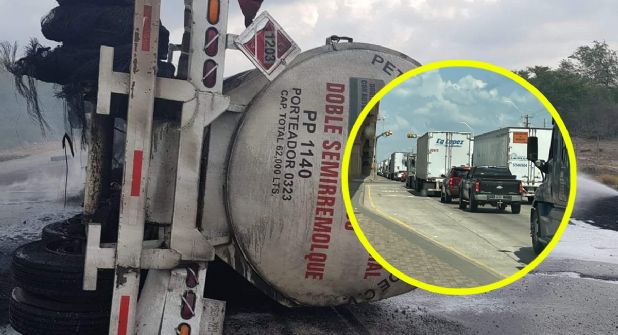 El congestionamiento provocado por el accidente es severo, el tractor y la “pipa” quedaron recostados en la vía.