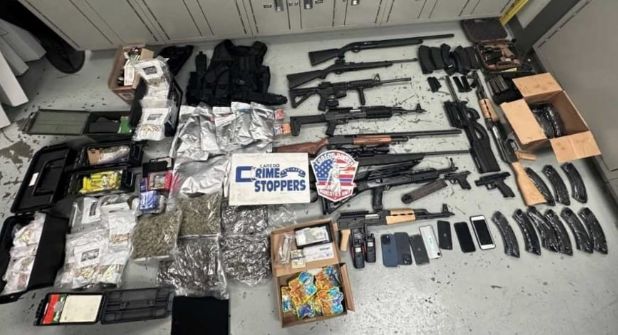 Con 14 armas de fuego, libras de marihuana, hongos alucinógenos, gomitas de marihuana, 6 mil 500 dólares en efectivo y municiones a granel, fueron arrestados 2 tipos ayer por la tarde en residencial Del Mar C.