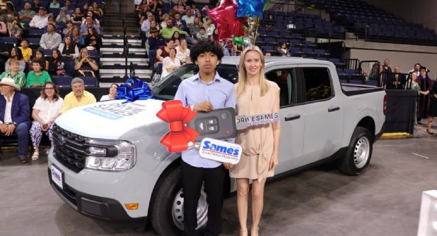 Asistir a clases todos los días valió la pena para Gabriel Ramos, estudiante de Martin High School, quien fue el ganador de un flamante Ford Maverick 2024 donado por Sames Auto Group.