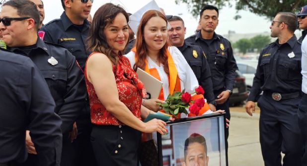 Aunque el padre de Gianna García no pudo compartir el momento con su hija, sus compañeros del Departamento de Bomberos de Laredo no tardaron en ocupar su lugar para felicitarla y celebrar este hito en su vida.