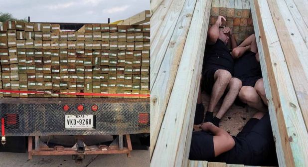 Una quintilla de indocumentados de México y Honduras viajaban bajo una pila de maderos o tablones en una bien cuidada elaboración de una falsa camioneta de trabajos rudos o cargas pesadas, fueron asegurados por el DPS en Cotulla, Texas.