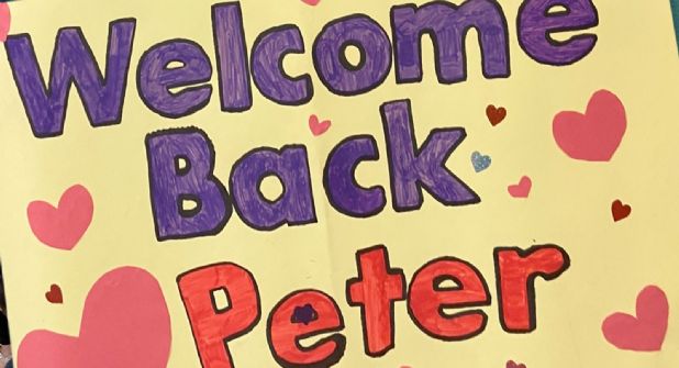 "Gracias", dijo mientras los estudiantes se alineaban en los pasillos con carteles y matracas. Los niños vitorearon, aplaudieron y corearon: "¡Peter! ¡Peter!".