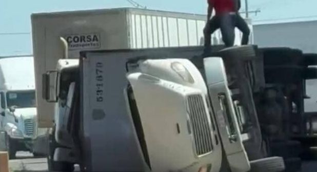 En el primer caso, un tráiler no logró mantenerse en su carril, pues la inercia le ganó y terminó volcado sobre un costado esto en el cruce de Bob Bullock y Las Minas, provocando un congestionamiento severo en el área.