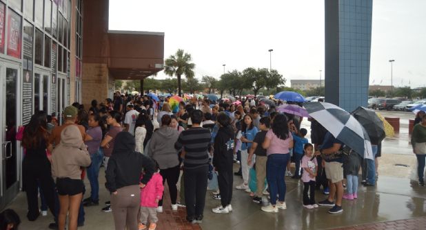 Ni la lluvia detuvo a la gente a asistir a Sames Auto Arena para recoger sus paquetes de útiles escolares del Programa de Emergencias 911 y la Policía de Laredo. Desde muy temprano las familias llegaron a formarse para la repartición de los materiales.