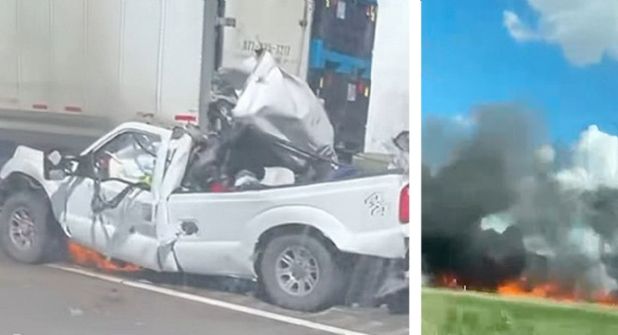 La Ford “pickup” año 2011, se impactó contra el remolque cerrado, en los carriles hacia el norte,. El extenso y fiero fuego obligó al cierre de toda la vía en ambos sentidos.