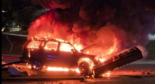 El auto fue pérdida total por el fuego, el hombre y la dama que le acompañaban lograron ponerse a salvo, resultaron ilesos; a él lo arrestaron por conducir bajo intoxicación, daño en propiedad y oponerse al arresto.