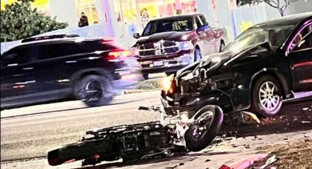 Grave resultó el motociclista al chocar contra un auto sedan negro en Calton y San Francisco frente al gimnasio Plante Fitness, poco antes de las 09:30 de la noche de este miércoles.