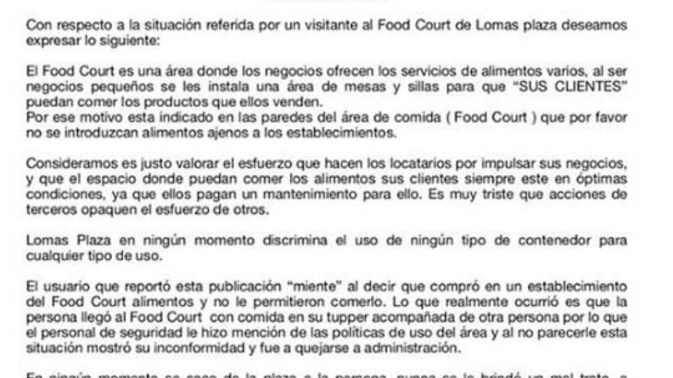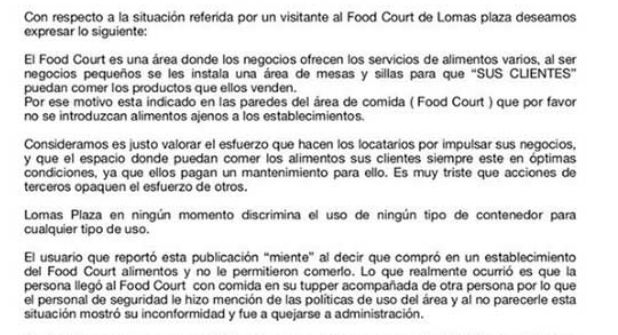 Para no hacer el cuento largo, el señor me faltó al respeto muchas veces y no me quedó de otra más que ir a levantar una queja a la administración.¿Como pretendemos crear cambios de conciencia, si nos están obligando a usar plásticos solo para asegurar el consumo de un privado?Yo sí creo y los invito a que usemos tuppers y sigamos contagiando a las personas que nos rodean a implementar acciones que ayuden a salvar al planeta, llámese amigos, familia, compañeros de trabajo pero también hacer un llamado a las empresas a implementarlo. Ojalá que esta experiencia haga que Lomas Plaza Fernandez Gonzalez pronto sea un establecimiento socialmente responsable.