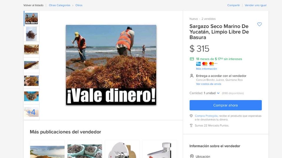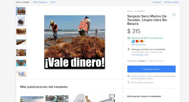 El sargazo ¡vale dinero!, así se ofrece la macroalga que afecta severamente las playas del Caribe Mexicano en el portal de Mercado Libre, donde alcanza precios de entre 310 y 320 pesos el costal de cinco kilogramos.