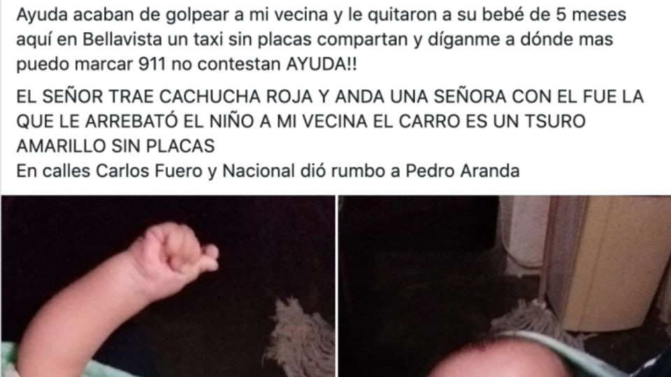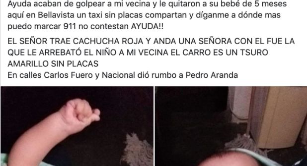 “Por favor compartan, ella es la bebé que se acaban de robar aquí en bellavista en Carlos Fuero y Nacional, tiene 5 meses.”