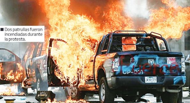 GUADALAJARA.- Un grupo de personas que participaron en una protesta por el asesinato de Giovanni López, vandalizaron el Palacio de Gobierno de Jalisco e incendiaron dos patrullas en inmediaciones del lugar.