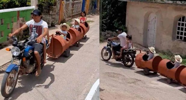 Viendo esta problemática un papá originario de Yucatán fabricó un pequeño tren utilizando barriles de metal, mismo que es jalado por él con su motocicleta.