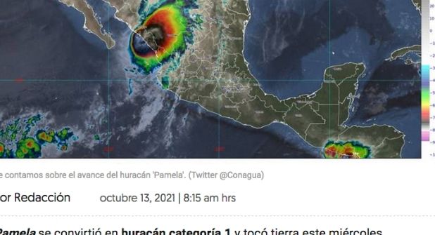 CIUDAD DE MÉXICO.- La mañana de este miércoles el huracán Pamela de categoría 1 en la escala Saffir-Simpson tocó tierra en las inmediaciones de los municipios de San Ignacio y Mazatlán, en Sinaloa, dio a conocer la Comisión Nacional del Agua (Conagua) a través de Twitter.