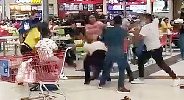 Integrantes de dos familias pelearon a golpes con puño limpio, arañazos, y hasta mordidas en el interior de Plaza Comercial Sendero La Fe en Apodaca debido a que ambos clanes querían quedarse con una mesa en el área de comidas del centro comercial.