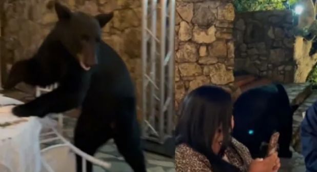 El oso negro se acerca a otra mesa con invitados mientras una persona grita "¡no te muevas!", ante la vista de una mujer y un hombre, este último ni siquiera se espanta y de hecho sigue comiendo sin preocupación.