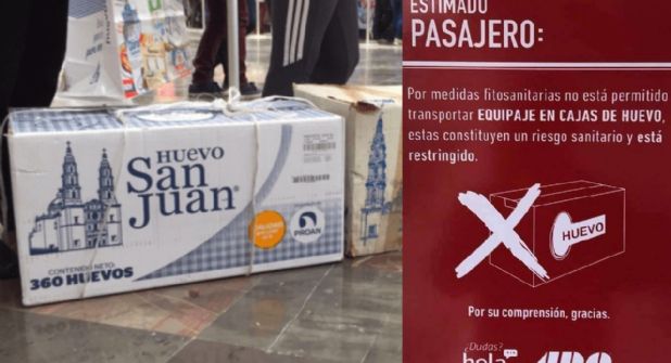 "Por medidas filosanitarias no está permitido transportar equipaje en caja de huevo, estas constituyen un riesgo sanitario y está restringido" indican los letreros.