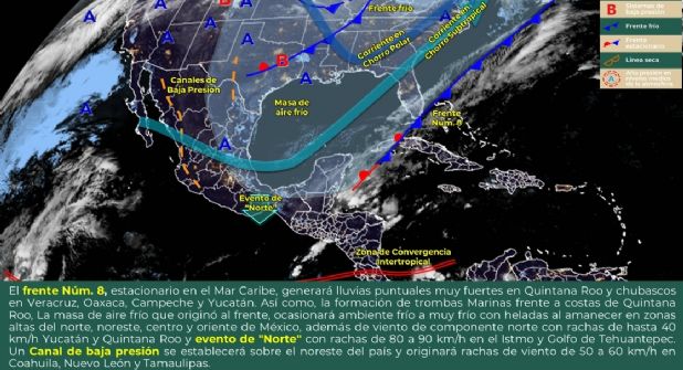 Sobre el Mar Caribe se encuentra estacionado el frente frío número 8, por lo que se presentarán lluvias y bajas temperaturas en varios estados del país. También se pronostican heladas en zonas montañosas y municipios del norte de México.