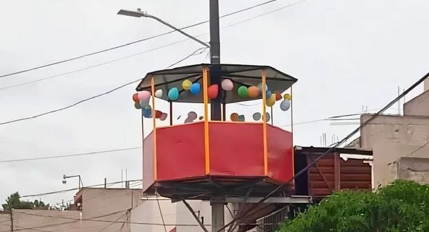 En las imágenes se ve cómo el poste de luz funciona como eje de construcción para el salón, el cual tiene forma de quiosco y está decorado con globos, y se sostiene en el aire por una estructura de metal que conecta la base con una casa, por la cual se puede acceder a la estructura.