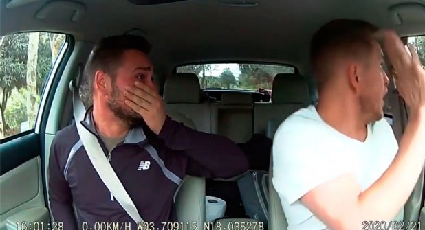 El copiloto sugiere que arranquen el auto, sin embargo, el conductor detiene el auto y levanta las manos.