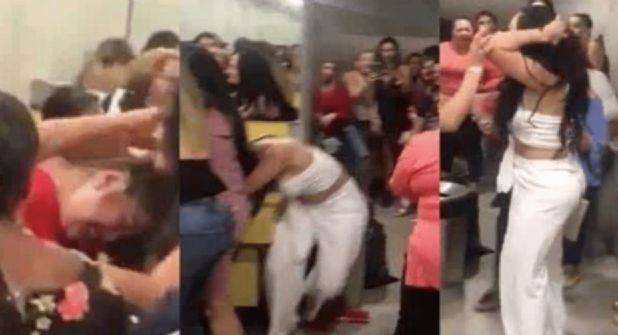También se puede ver el momento en que las mujeres se jalonean mientras otros asistentes de la posada intentan separarlas.