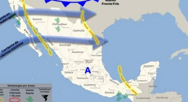 El frente frío no traerá frío intenso a México, sólo se prevén lluvias intensas, así como vientos muy fuertes, por lo que podr��an presentarse tolvaneras en Tamaulipas, Chihuahua, Coahuila, Nuevo León.
