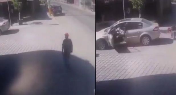 En el material se puede ver el momento en que el sujeto se acerca lentamente al auto para recibir un golpe y después, finge una caída dramática.