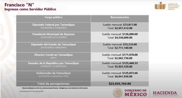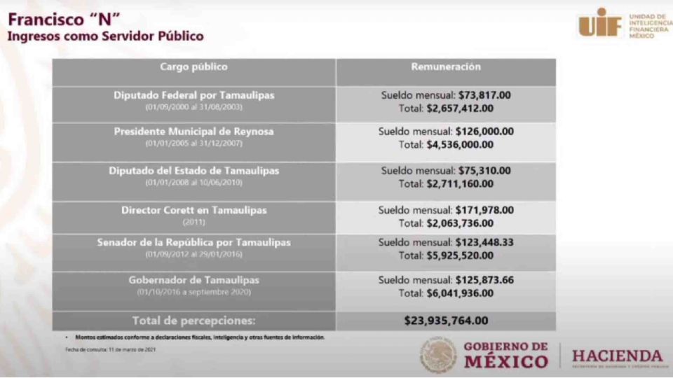 En la presentación de la Unidad de Inteligencia financiera UIF desglosaron los sueldos del gobernador de Tamaulipas desde sus inicios como funcionario público, pues datan desde su cargo como diputado federal en el 2003.
