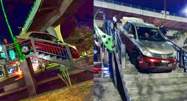En Naucalpan,el conductor de un automóvil decidió ahorrarse tiempo y cruzó con todo y su vehículo el Periférico Norte utilizando un puente peatonal, hasta que quedó atorado en las escaleras, pues, según él, no se dio cuenta que ingresaba a un paso solo para peatones.