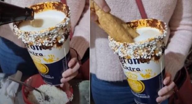 En las imágenes se puede ver como a la orilla del vaso le bañan de mole, luego crema y al final queso rallado, seguido de llenar el vaso de cerveza y agregarle dos flautas a la bebida.