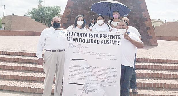 Con una manta gigante en la que se lee la leyenda “Tu carta está presente, mi antigüedad ausente”, los “teachers” en Nuevo Laredo se plantaron frente al Monumento a los Fundadores, pues señalaron que aunado a la promesa incumplida, el gobierno del Estado les exige un pago que va de 300 mil a medio millón de pesos en una sola exhibición para poder reconocer los años ya trabajados.