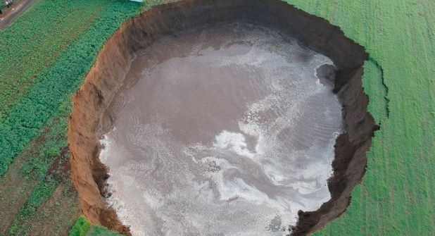 El enorme socavón que surgió a final del mes de mayo en terreno agrícola crecerá todavía más, hasta el momento es más grande que una cancha de futbol y ha comenzado a tragarse una casa e incluso hace unos días tenía dos perros atrapados en su interior.