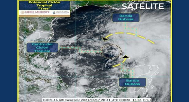 Un Potencial Ciclón Tropical Tres se forma en el golfo de México y actualmente se localiza a 305 kilómetros al noreste de Celestún, Yucatán, reporta Protección Civil