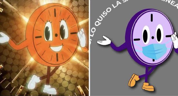 En la imagen se ve un personaje similar a “Miss Minute” de la serie de Loki, pero este, de color morado con un cubrebocas puesto acompañado de la frase “así lo quiso la sagrada línea del tiempo”.