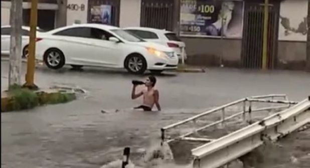 En redes sociales circula un video que inmediatamente se hizo viral donde se observa a un hombre sin playera en medio de la lluvia y la inundación, sentado en el pavimento disfrutando de una caguama en mano.