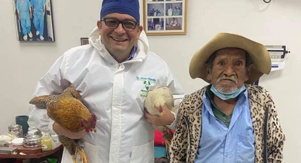A pesar de haber notificado la gratuidad de la intervención quirúrgica, el hombre mayor insistió en darle como recompensa dos gallinas por sus servicios. Este hecho enterneció al doctor, quien le pidió una fotografía para poder subir la historia.