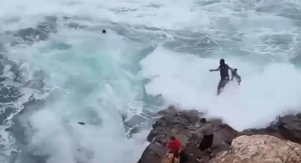 En el video grabado durante el fin de semana, el día domingo, se puede ver como un grupo de personas baja hasta la zona rocosa que se encuentra muy cerca del mar, cuando un sorpresivo y fuerte oleaje rodea toda la zona en la que los turistas se encontraban caminando, arrastrándolos entonces hacia el mar.