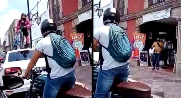 Un ciclista pasa su bicicleta por encima de un automóvil estacionado en ciclovía, luego de que el conductor de dicho auto decidiera no moverlo a pesar de los insistentes reclamos de quienes se encontraban por la zona del suceso; los hechos que ocurrieron en el Centro Histórico de la ciudad de Querétaro, quedaron grabados en video y fue compartido en redes sociales, la ciclista trabaja para una app de repartidores.