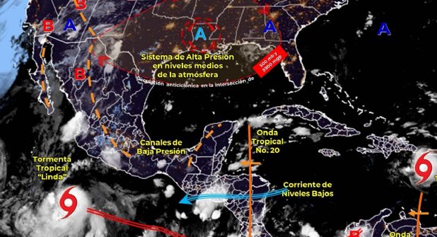Fue alrededor de las 7:00 de la mañana de hoy miércoles cuando el Servicio Meteorológico Nacional informó que el movimiento de la tormenta tropical Linda va provocar lluvias sobre los estados del occidente y sur del país, dichas lluvias serán fuertes y puntuales. La tormenta tropical también se encuentra cercana al sur de Manzanillo, Colima.
