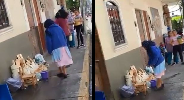 La abuelita completamente mojada, comienza a retirar sus artesanías mojadas, como cucharas de madera y otros utensilios, mientras desde arriba la mujer barre el agua que lanzo para “correr” a la vendedora.