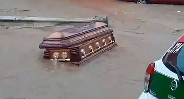 Veracruzanos afectados por el paso del fenómeno meteorológico fueron testigos cuando el Huracán Grace provocó un MACABRO desfile de ATAÚDES flotando sobre calles inundadas.