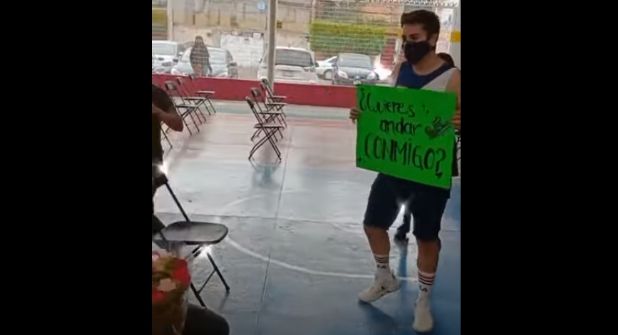 En la grabación podemos ver al joven preparando un cartel verde con plumones antes de que llegue su amigo al esperado encuentro. En la cartulina escribió la frase “¿Quieres andar conmigo?” como señal de su amor por él.