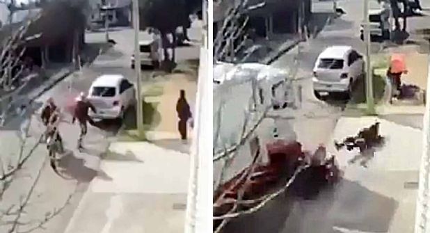 Cuando llevaban a cabo el robo con violencia un "vengador urbano" arrolló a uno de los ladrones impactando la motocicleta. El ladrón cayó de espaldas en el pavimento, pero se repuso y emprendió la huída dejando tirado su vehículo.