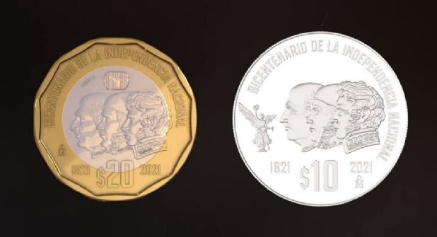 La moneda que conmemora los 200 años de haber logrado la Independencia de los españoles, tiene las efigies de Miguel Hidalgo, José María Morelos y Pavón y Vicente de Guerrero, de perfil hacia la izquierda.