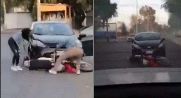 En uno de los videos que circula en internet se puede ver al conductor de la motocicleta a un lado del vehículo responsable del accidente, de donde bajan un hombre y una mujer de aproximadamente 20 años de edad.