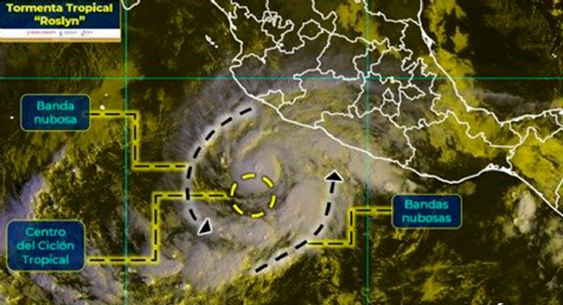 El Servicio Meteorológico Nacional dio a conocer que la tormenta tropical Roslyn podría impactar a cuatro estados de la República, donde se presentarán vientos y lluvias intensas, por lo cual, hacen un llamado a tomar precauciones y seguir las recomendaciones de las autoridades.