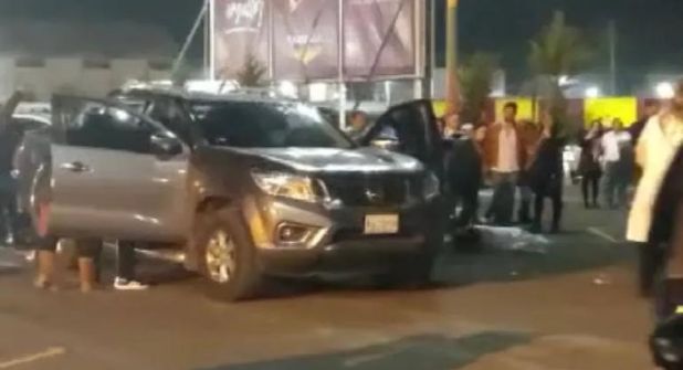 De acuerdo con las imágenes, un grupo de personas en probable estado de ebriedad, intentaron detener al conductor de la camioneta Nissan tipo Frontier con placas del Estado de México, quien arrancó con las puertas abiertas, llevándose a una mujer en el camino.