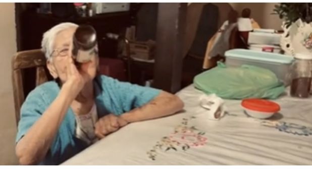 Al mismo tiempo se muestra cómo la abuelita hija, consume, hasta el fondo de la botella, el popular líquido ambarino.