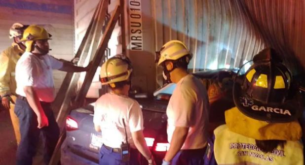 De puro milagro una mujer salvó la vida tras caer tráiler sobre su auto en el municipio de San Nicolás, Nuevo León.